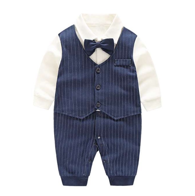 清潔感あふれるストライプ柄の蝶ネクタイ付きベビー服 フォーマルロンパース