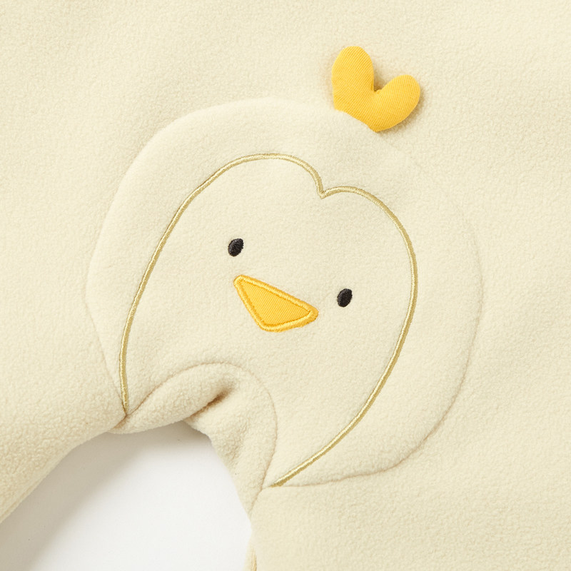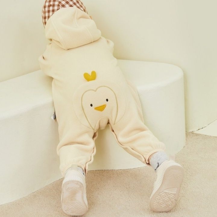 可愛らしいひよこの刺繍とハートモチーフが愛らしいベビー服のロンパースです。 フード部分はチェック柄の裏地付きで、頭部にはキュートな立体ハートがアクセントになっています。 やわらかな素材で赤ちゃんの肌に優しく、毎日の着替えやおむつ替えもスナップボタンで楽々です。 お部屋着はもちろん、お出かけにもぴったりな一枚で、出産祝いのギフトにも喜ばれます。