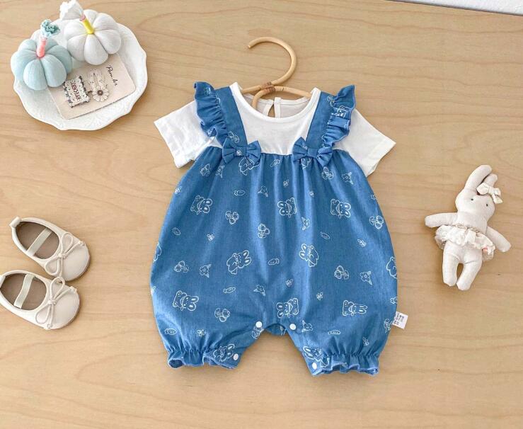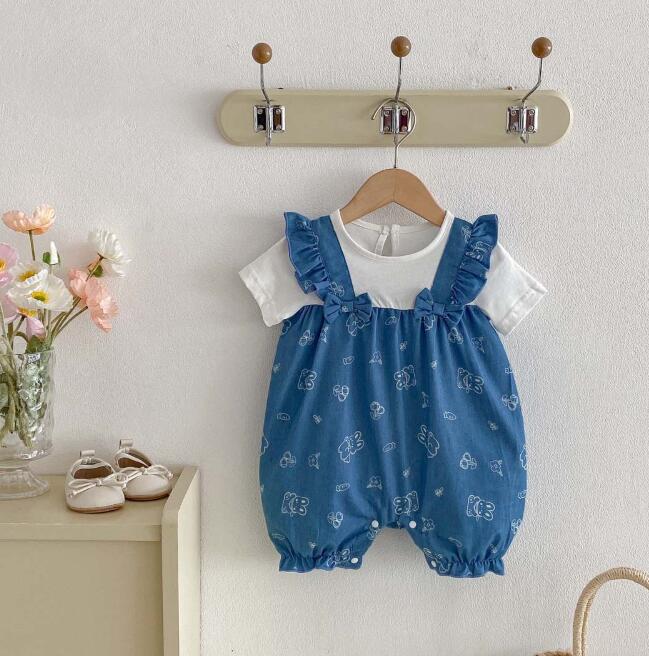 可愛いくま柄が散りばめられた涼しげなブルーの半袖ロンパースです。 白い半袖トップスとブルーのオーバーオール風デザインで、お出かけにも普段着にもぴったり。 フリルが付いた肩紐が女の子らしさを演出します。 高品質なベビー服で赤ちゃんの快適な着心地を実現しました。