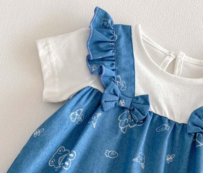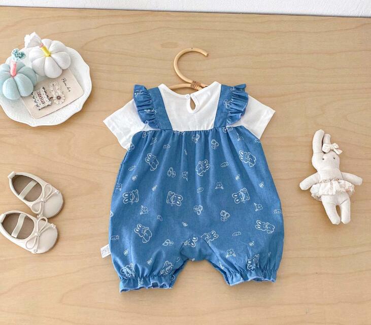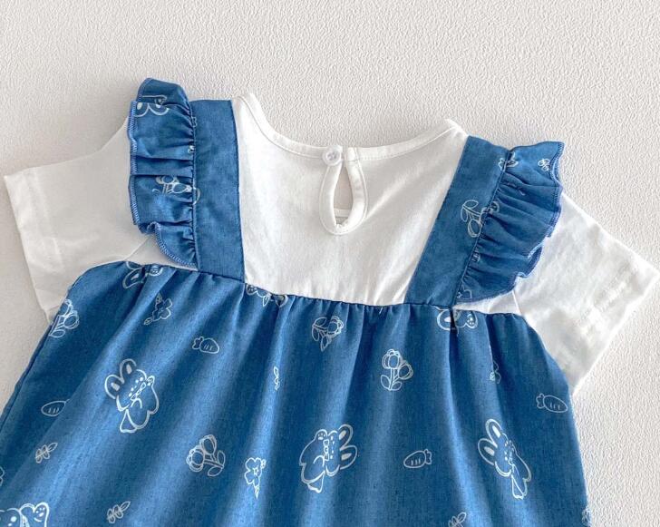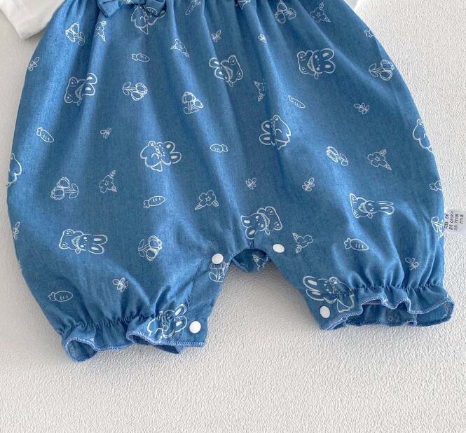 白い半袖トップスとブルーのオーバーオール風デザインで、お出かけにも普段着にもぴったり。