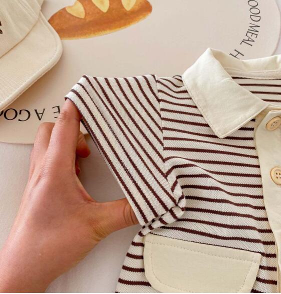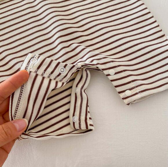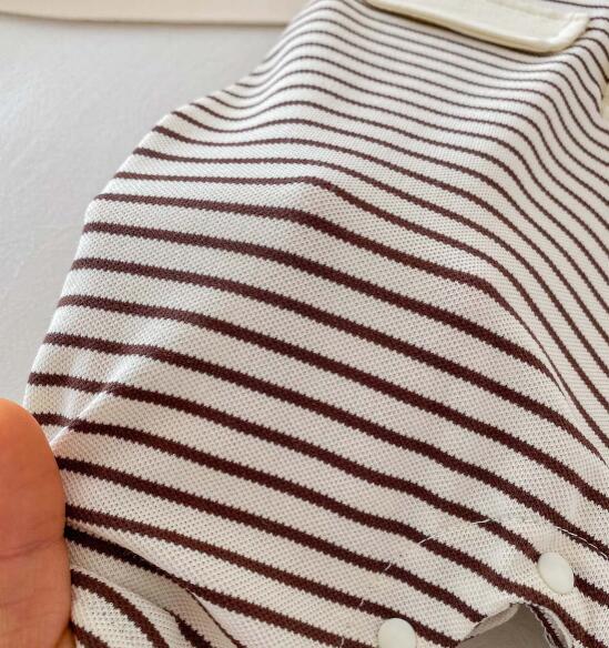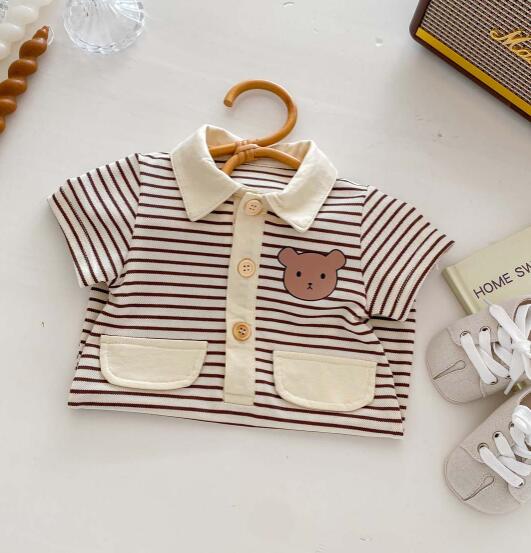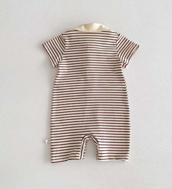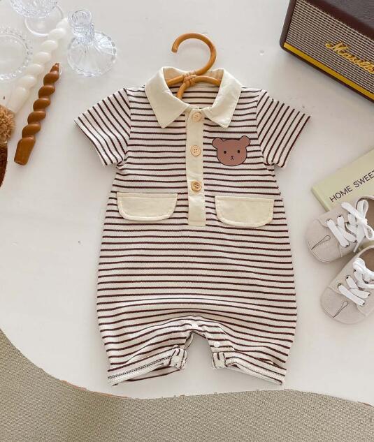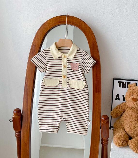 可愛いくまの刺繍がポイントのボーダー柄半袖ロンパースです。 襟付きデザインで上品な仕上がり、前開きボタンでお着替えも簡単。 毎日の普段着や保育園での着用にぴったりなベビー服です。 サイズ:66-90センチ