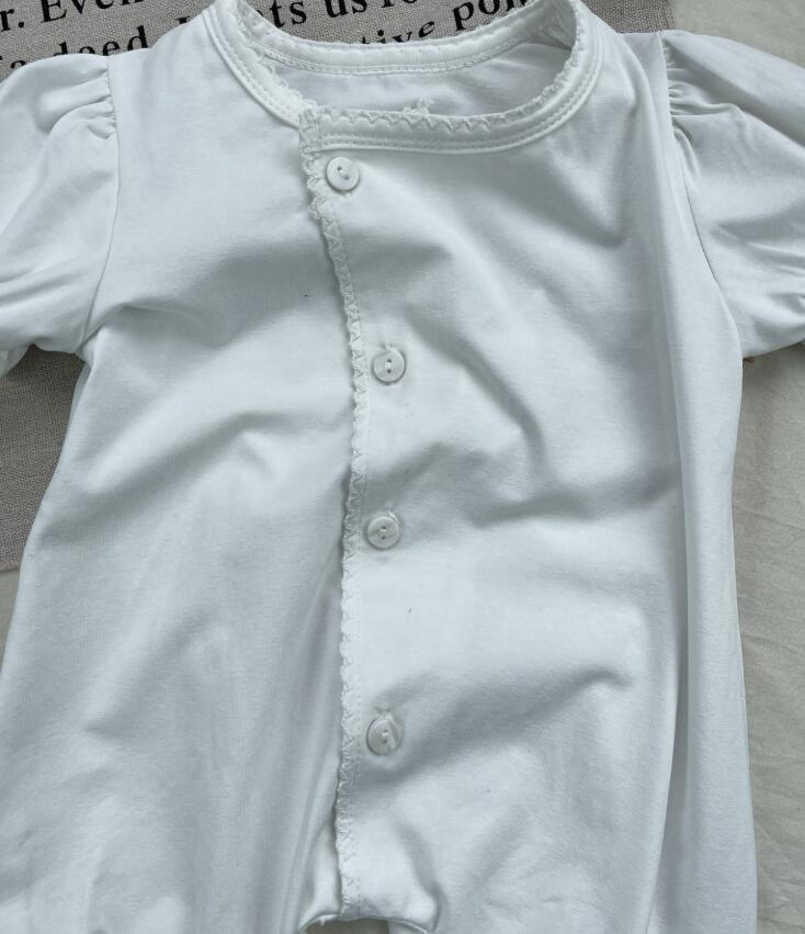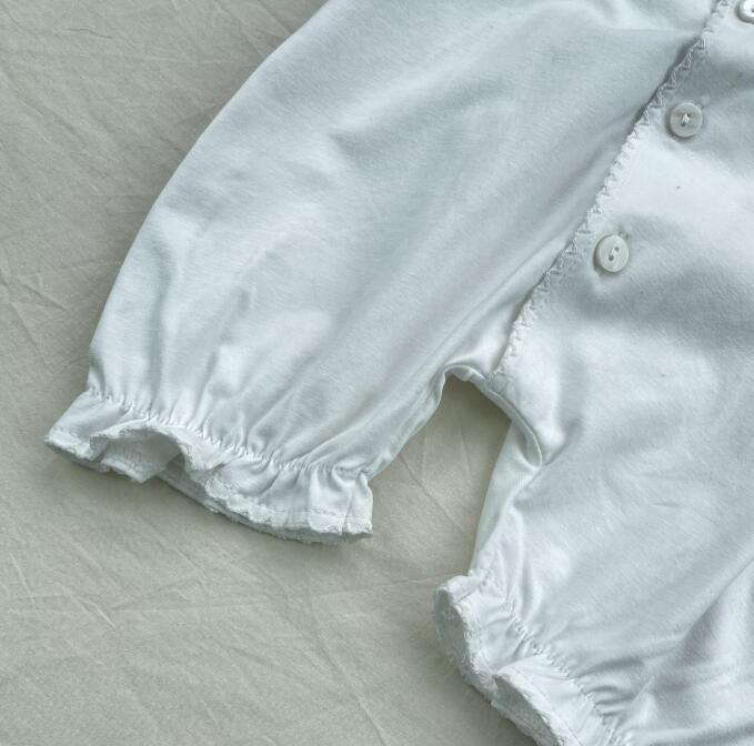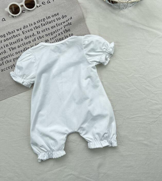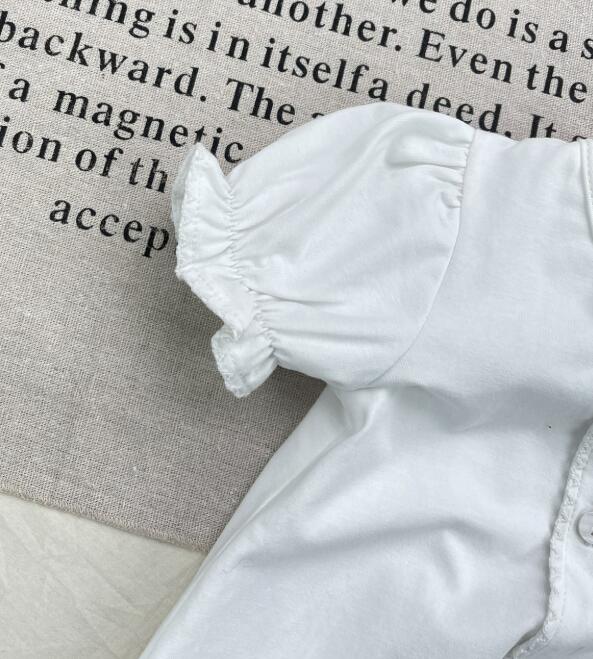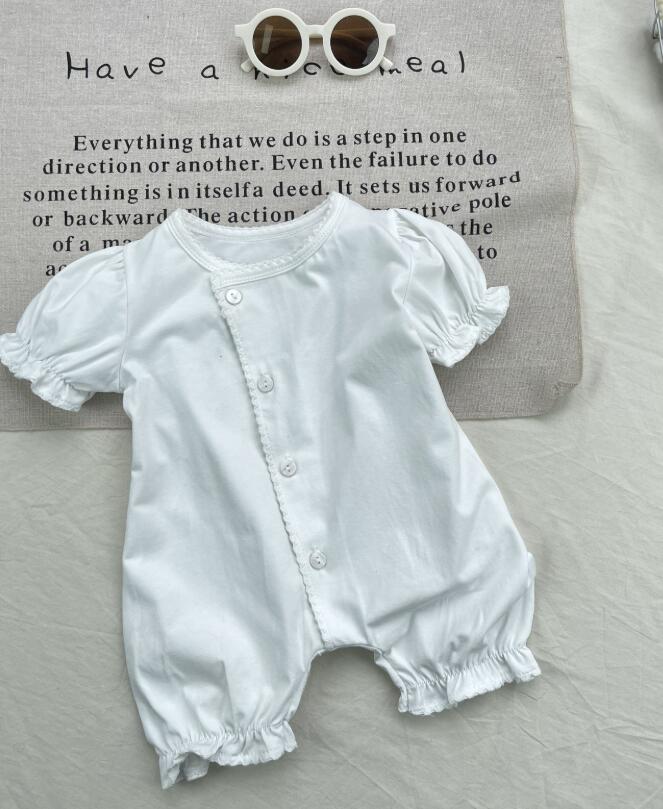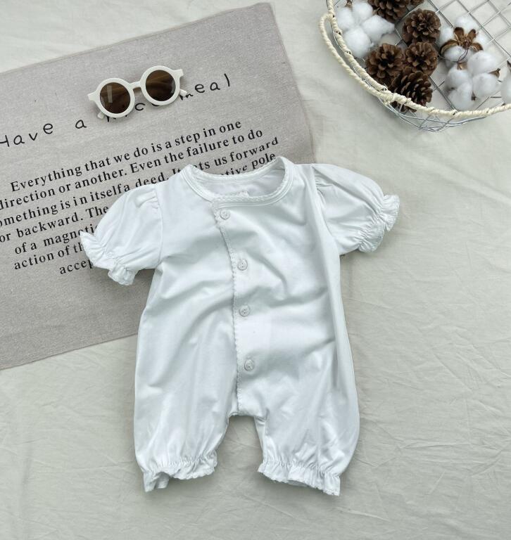 可愛いフリル袖が特徴的な白色のロンパースです。 上品なボタンデザインで普段着からお出かけまで活躍します。 やわらかな素材で赤ちゃんの肌に優しく、動きやすさも抜群。 ベビー服専門店がお届けする上質な一着です。
