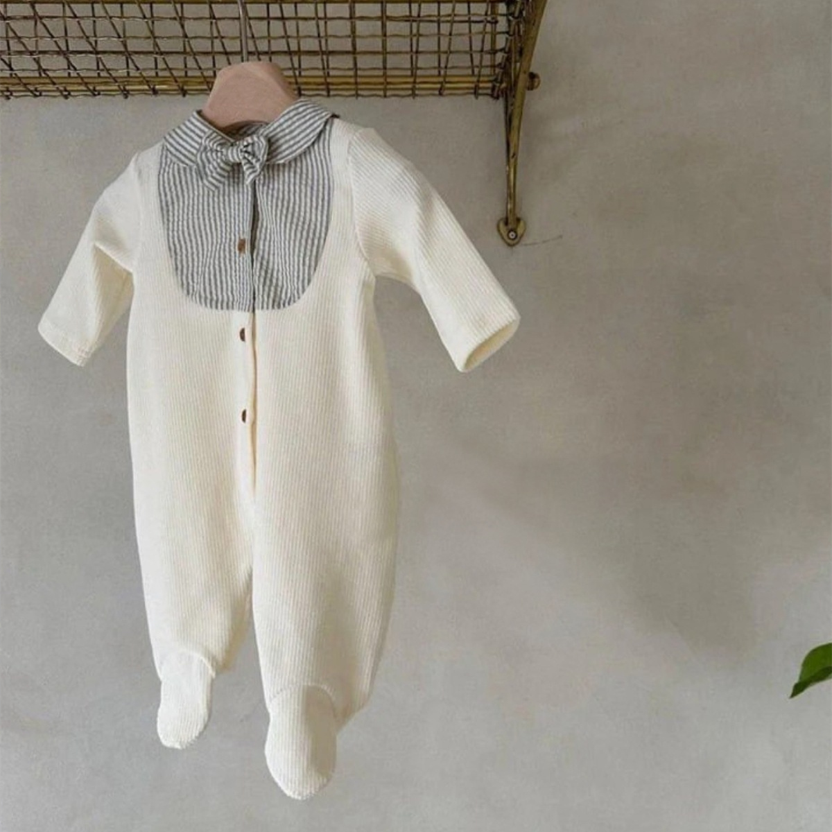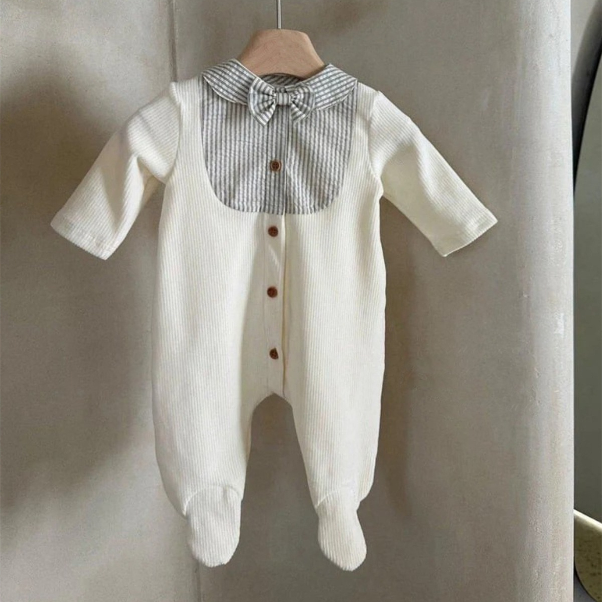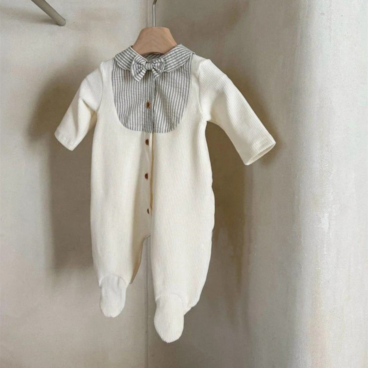 上品な襟デザインが特徴的なベビー服ロンパースです。