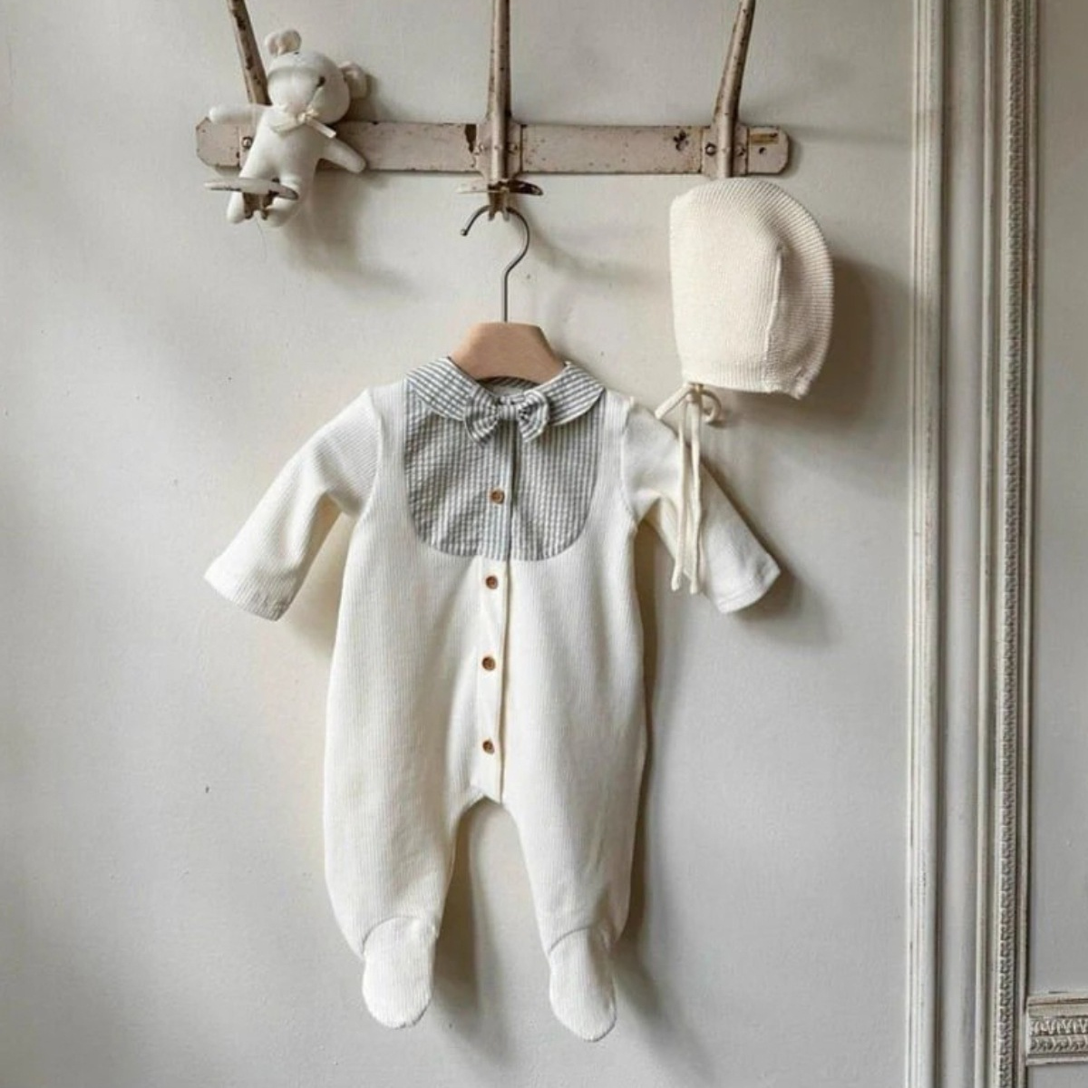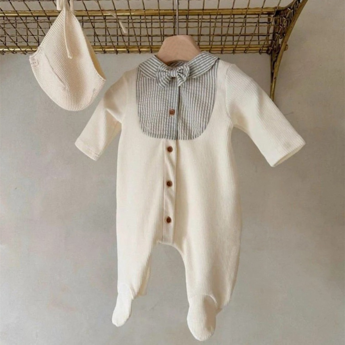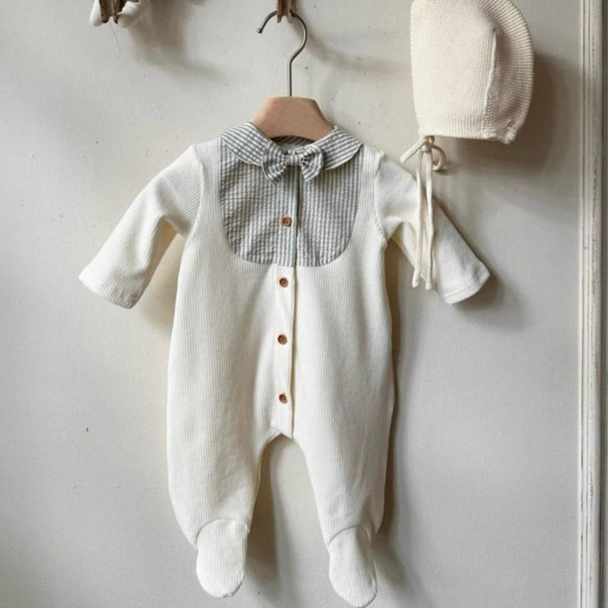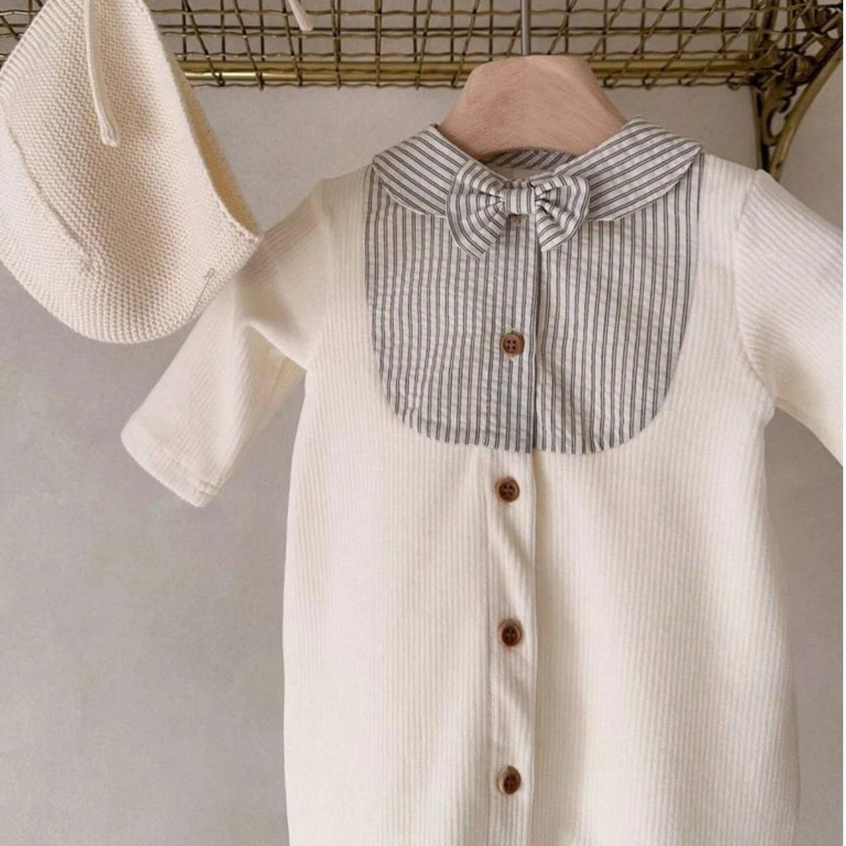 上品な襟デザインが特徴的なベビー服ロンパースです。