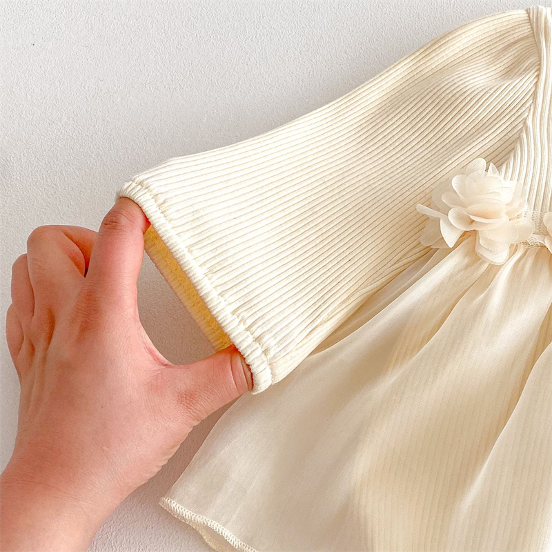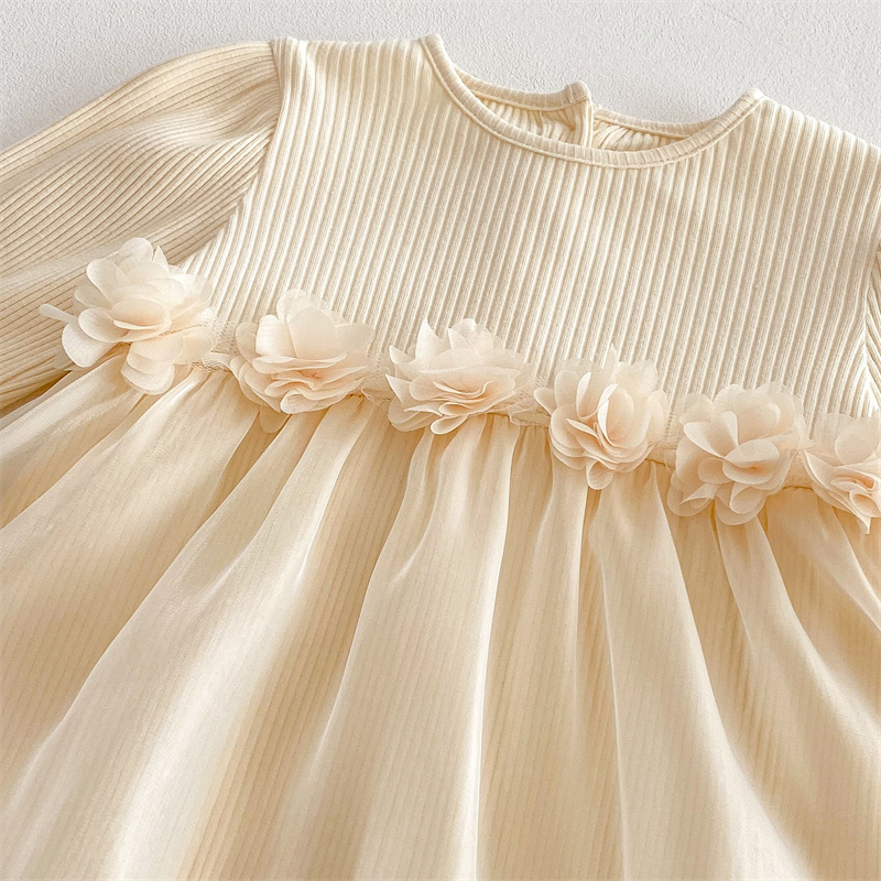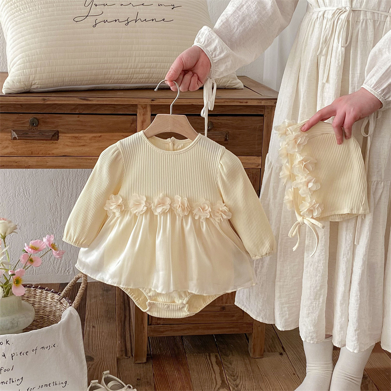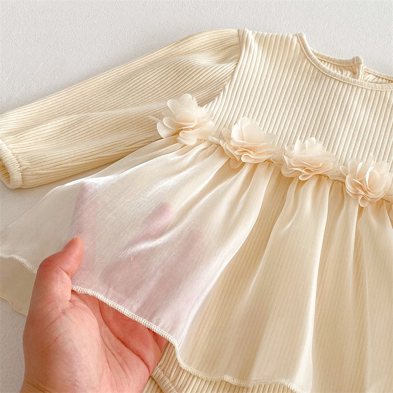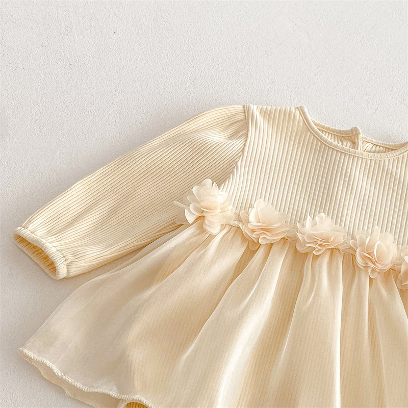 リブ素材の切り替えデザインと胸元の立体的なお花装飾が可愛らしく、
