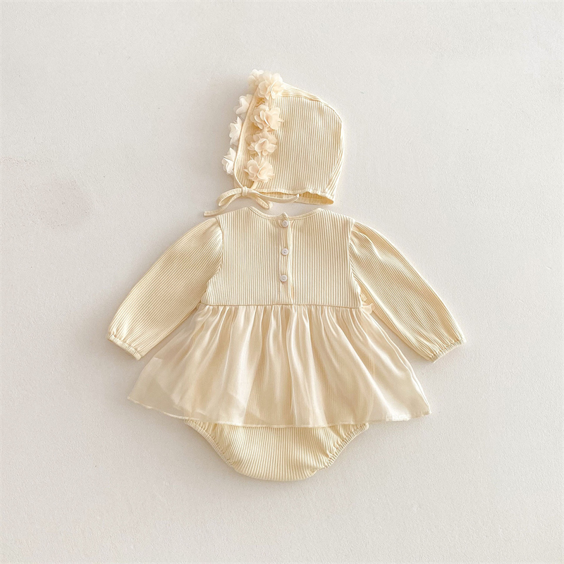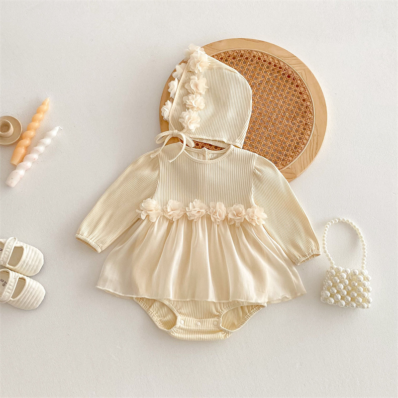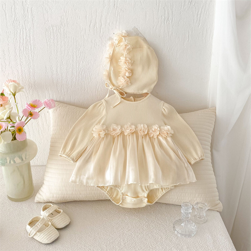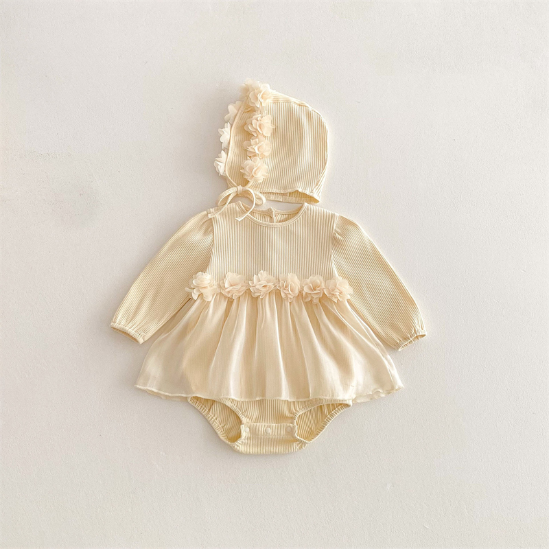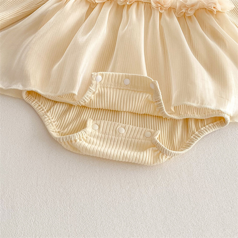 リブ素材の切り替えデザインと胸元の立体的なお花装飾が可愛らしく、