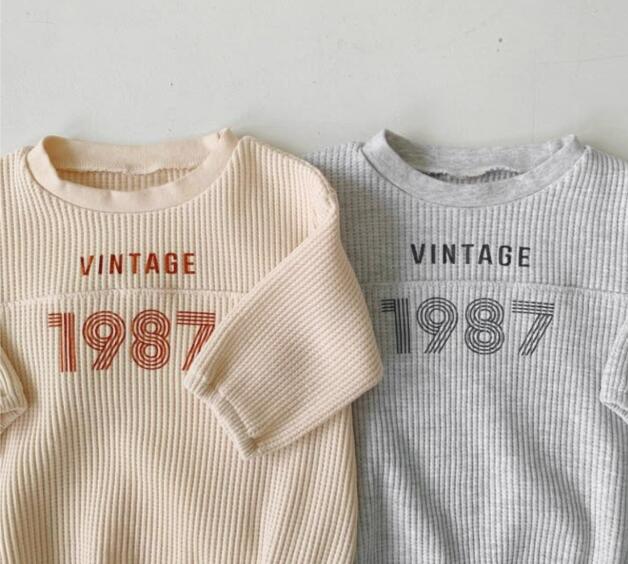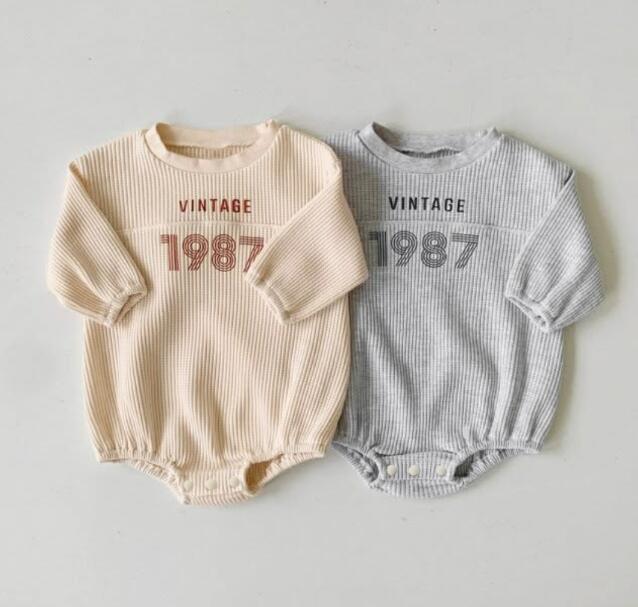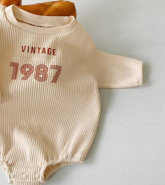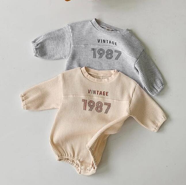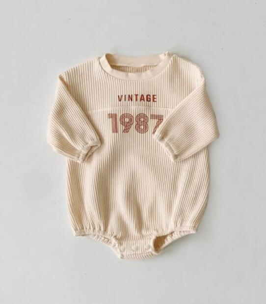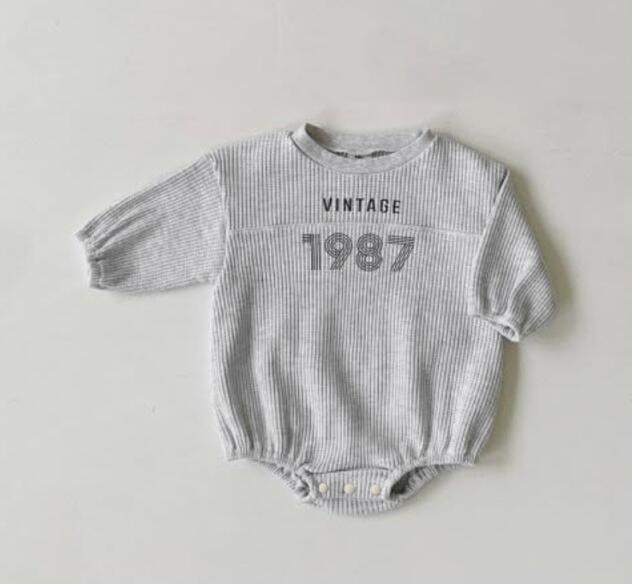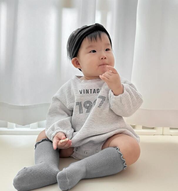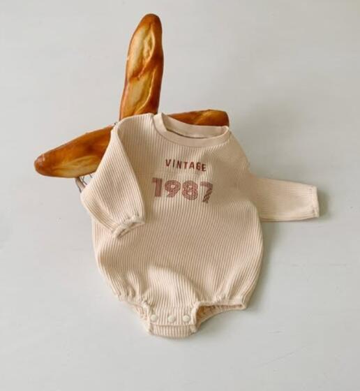 復古調のデザインがおしゃれな長袖ロンパースです。 柔らかなリブ素材で赤ちゃんの肌に優しく、動きやすさも抜群。 ベージュとグレーの2色からお選びいただけます。 普段着はもちろん、お出かけにもぴったりなベビー服です。